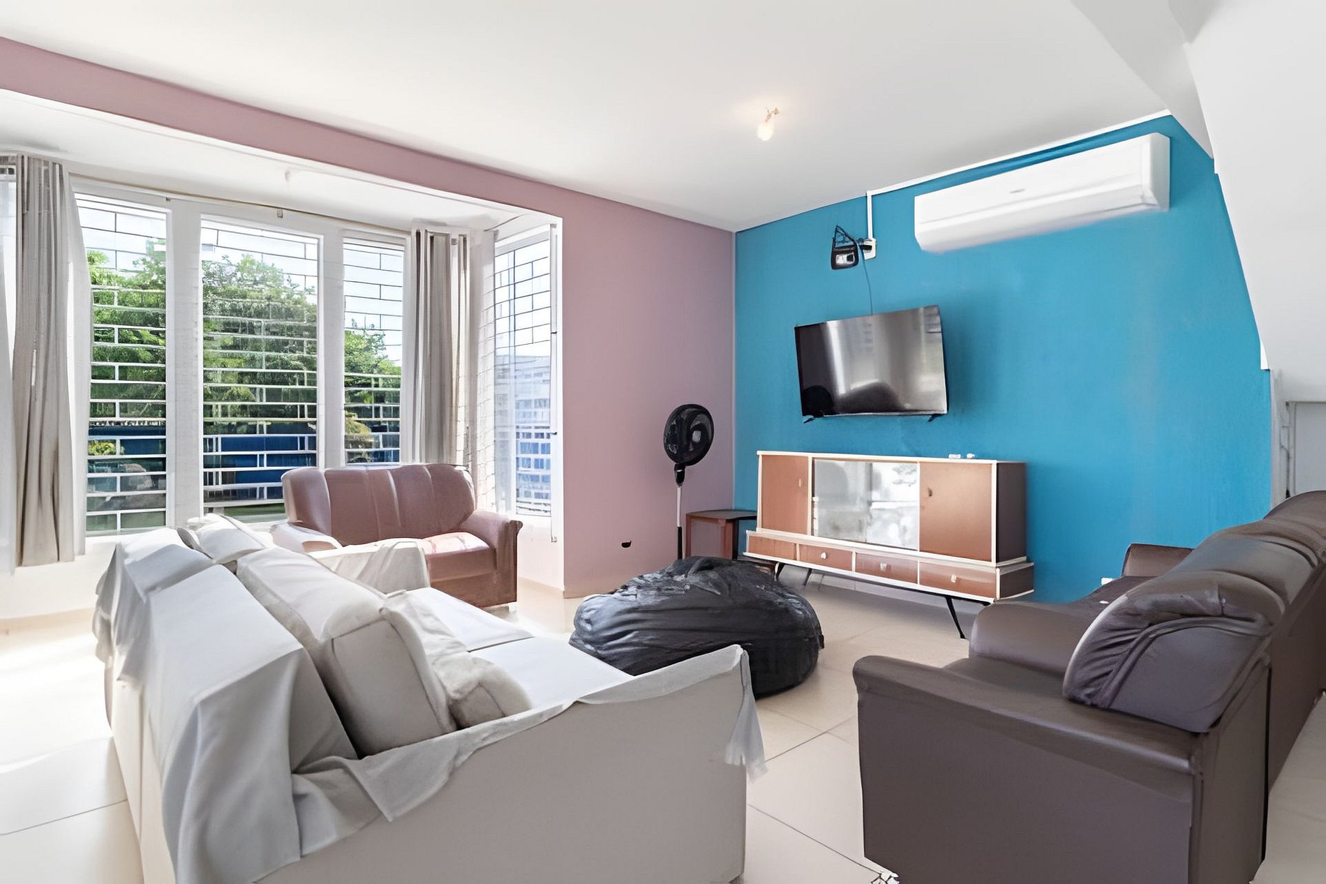 - Sala de Estar: três sofás, um puff, ar condicionado e TV Smart;