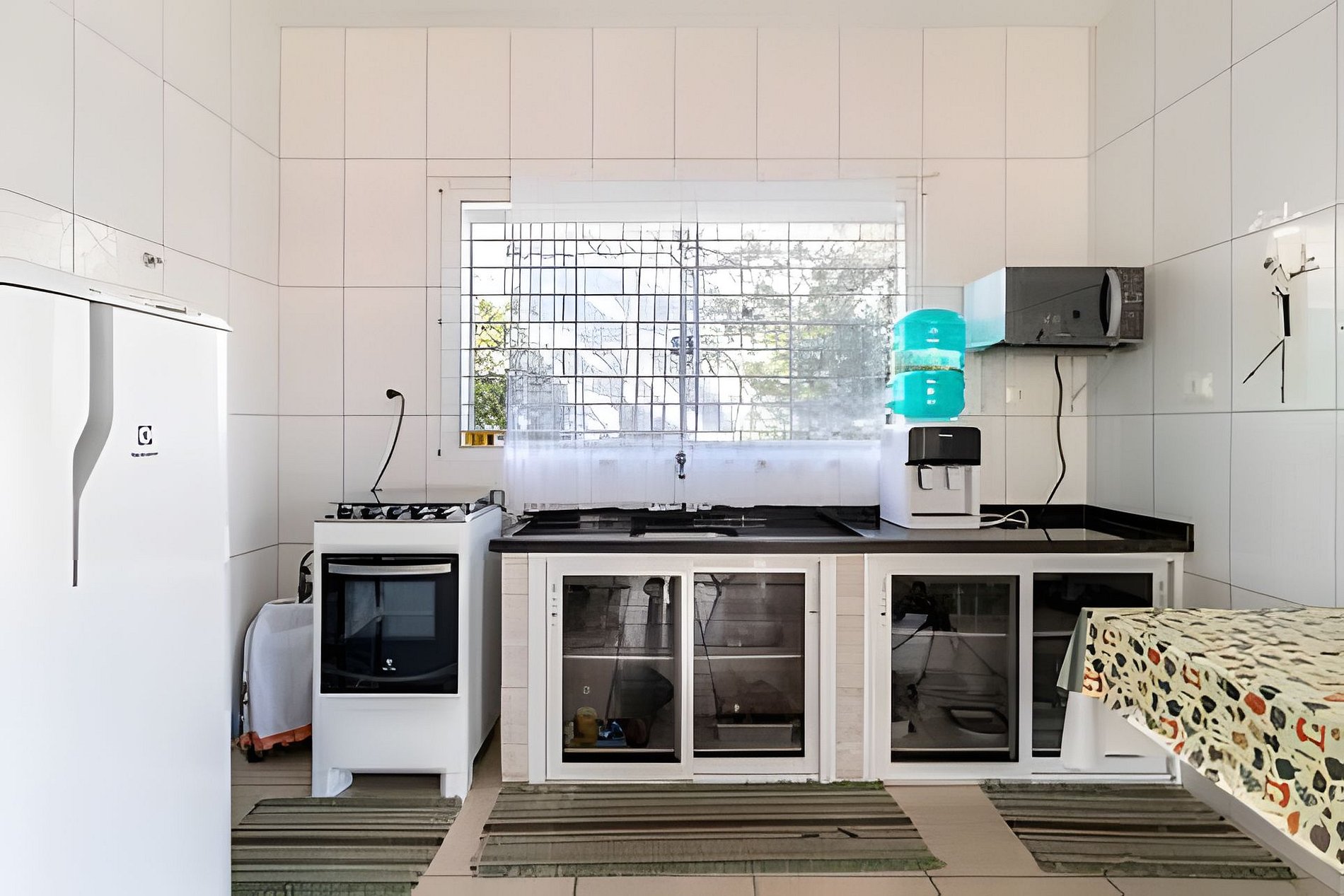 - Cozinha: geladeira (pequena), microondas, fogão, forno e utensílios;