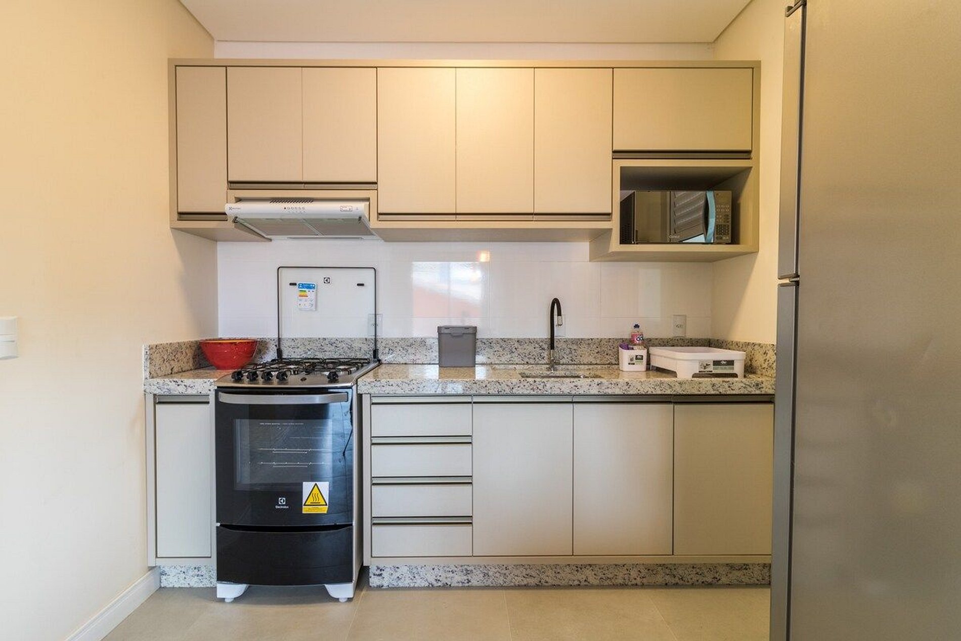 - Cozinha: geladeira, microondas, fogão, forno e utensílios;