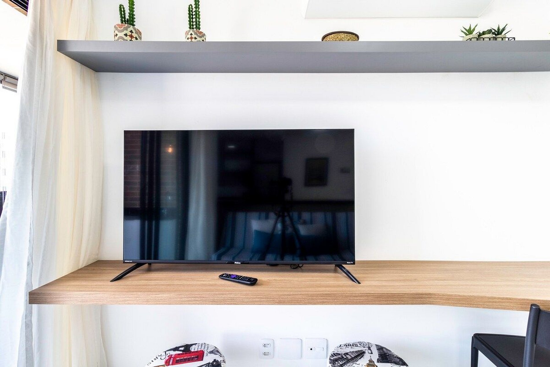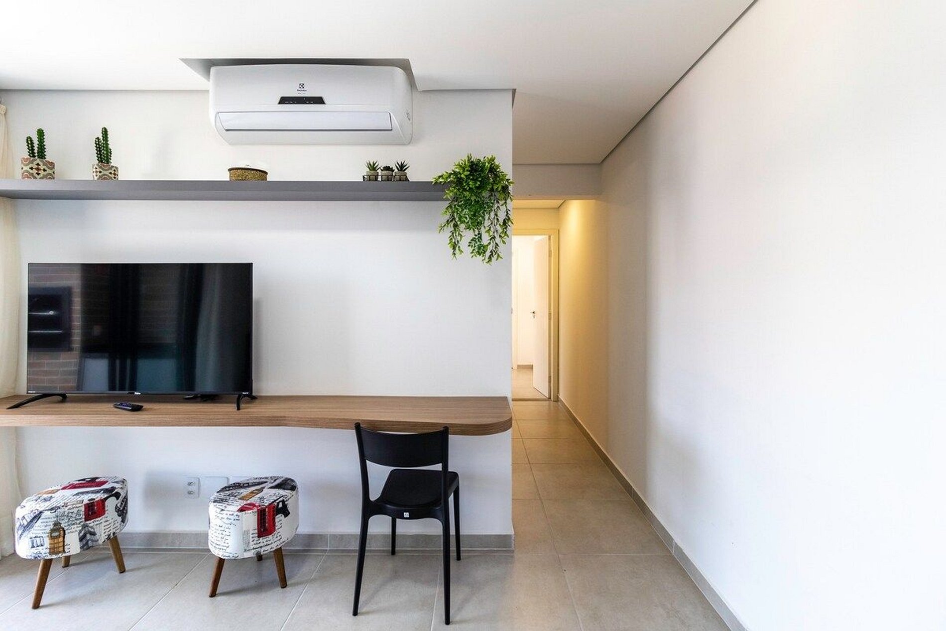 - Sala de Estar: sofá três lugares, ar condicionado e TV;