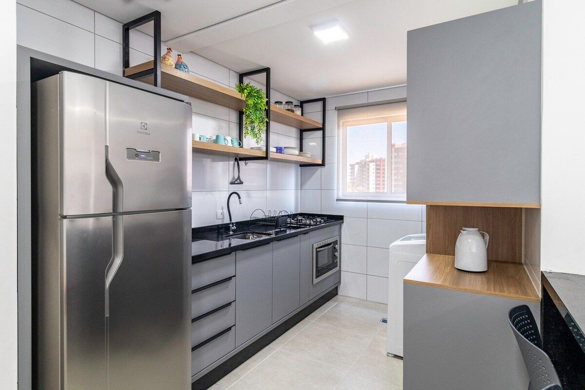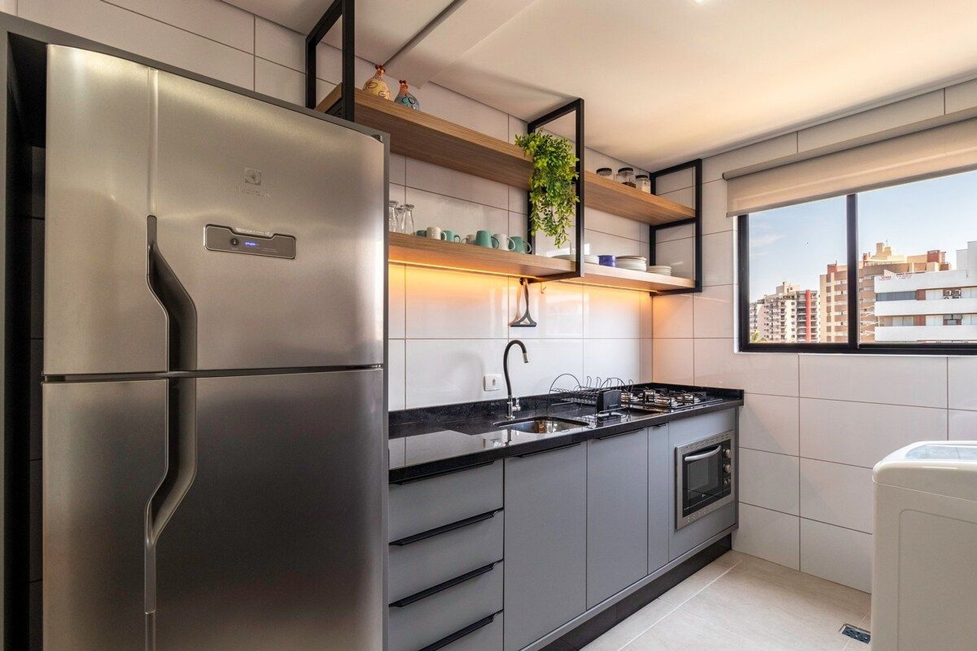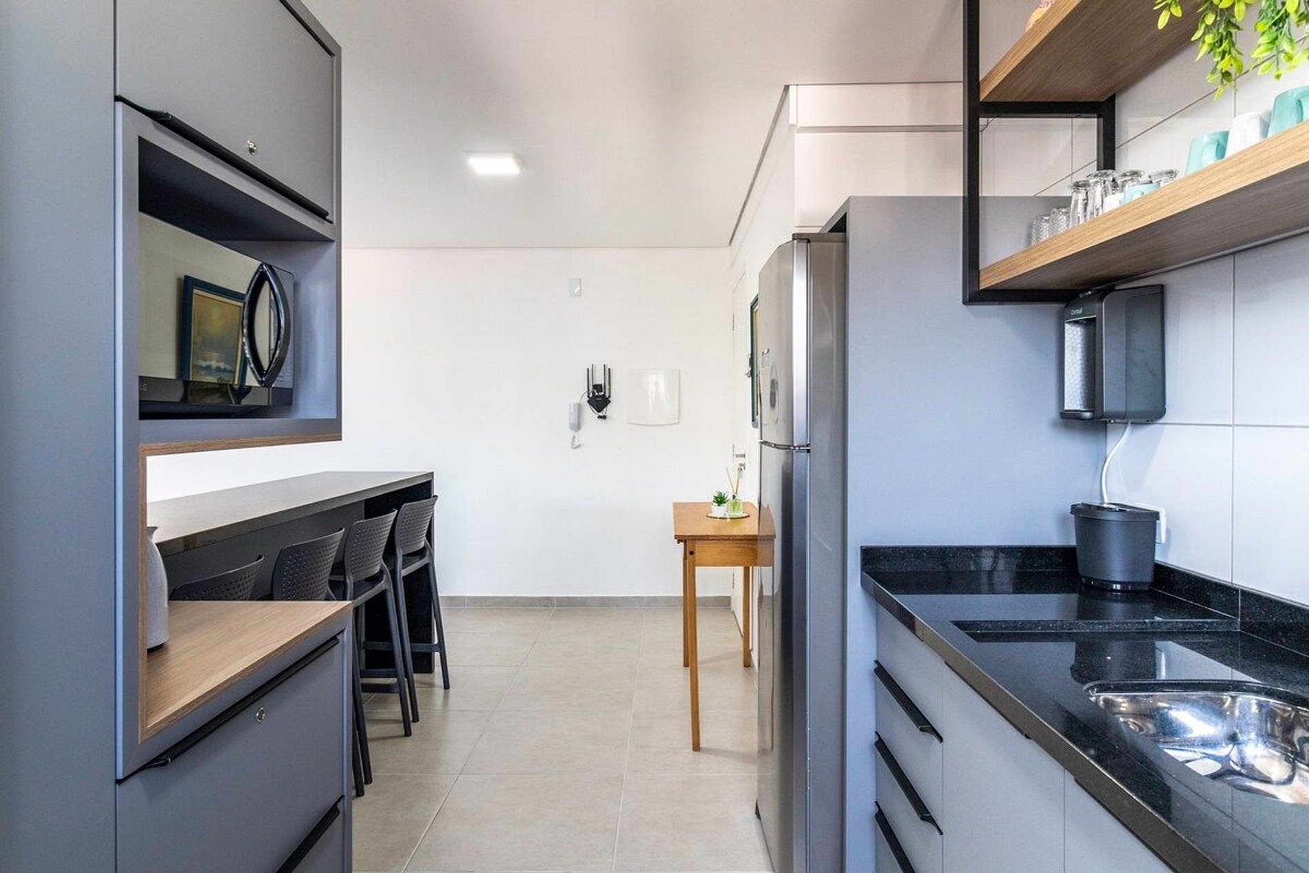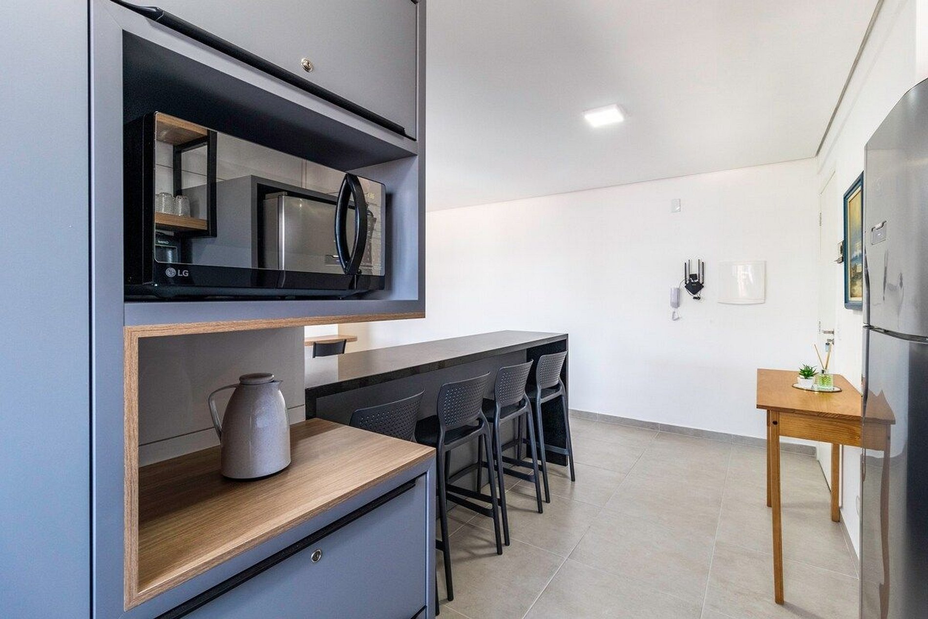 - Cozinha: bancada com quatro cadeiras, geladeira, fogão, forno, microondas e utensílios;